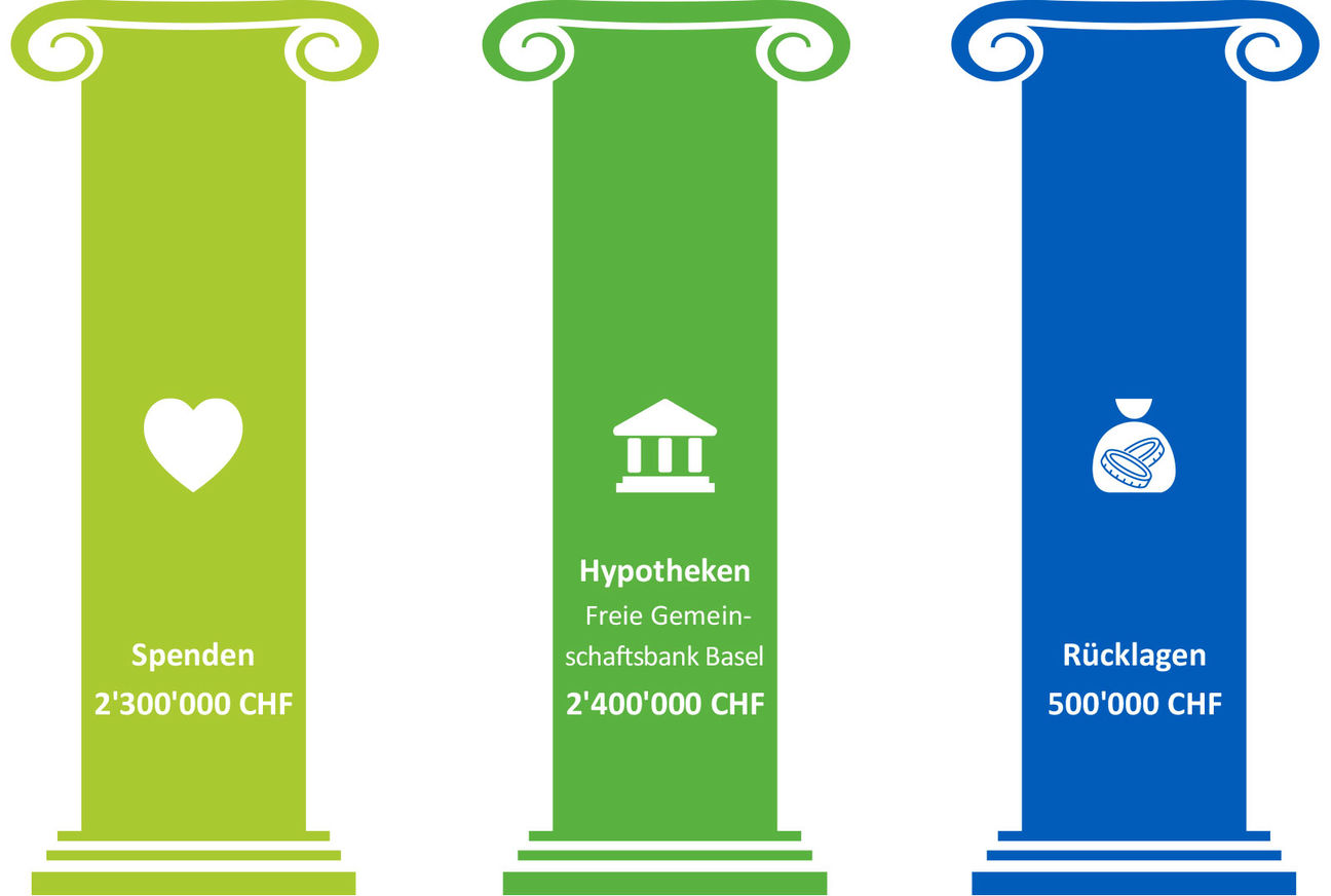 Zur langfristigen Absicherung des Projekts nehmen wir verschiedene Hypotheken in Höhe von CHF 2'400'000.– bei unserer Partnerbank, Freie Gemeinschaftsbank Basel, auf.